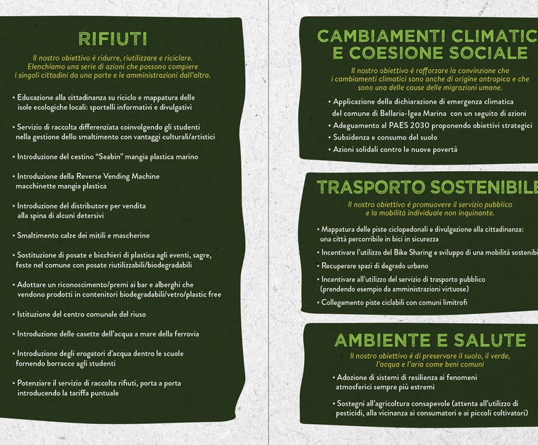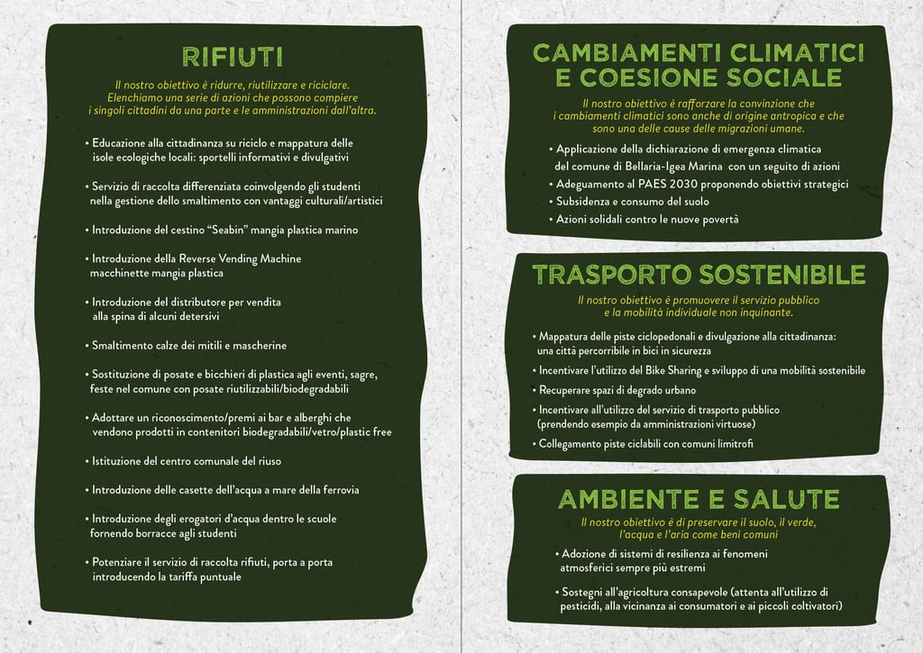 Viene redatto in collaborazione con la sezione locale di Legambiente il Manifesto Civico per la sostenibilità di Bellaria Igea Marina, un progetto di transizione ecologica, aperto e democratico, con l'obiettivo di mettere in primo piano la questione dell'emergenza climatica ed ambientale.