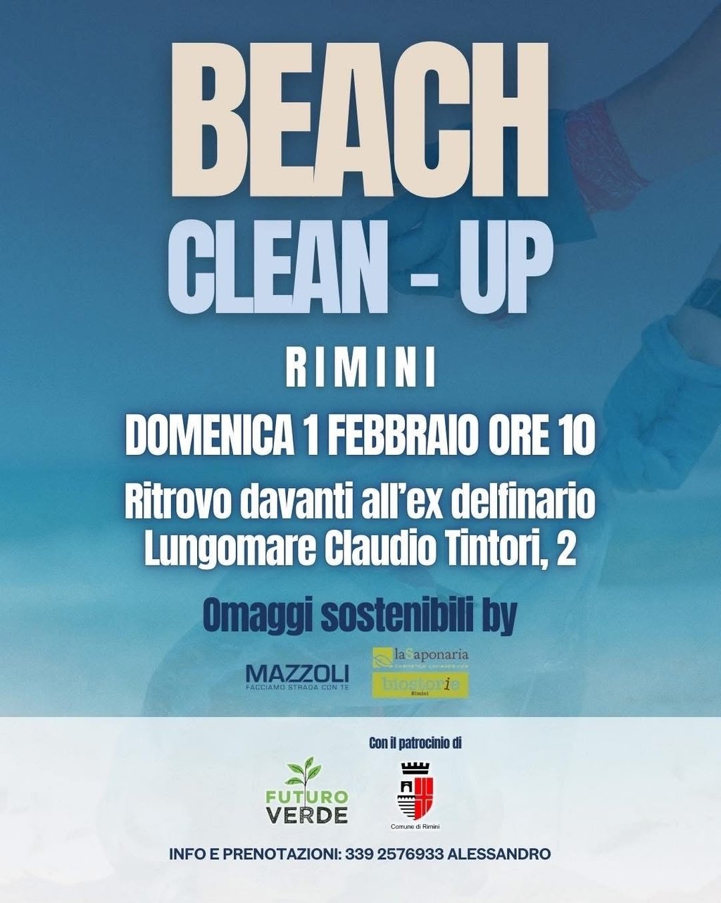Con il nostro Beach Clean Up, patrocinato dal Comune di Rimini, vogliamo prenderci cura del territorio costiero con gesti concreti: ripulire la spiaggia, raccogliere i rifiuti abbandonati e dimostrare che ogni piccola azione in fondo non è mai così piccola.