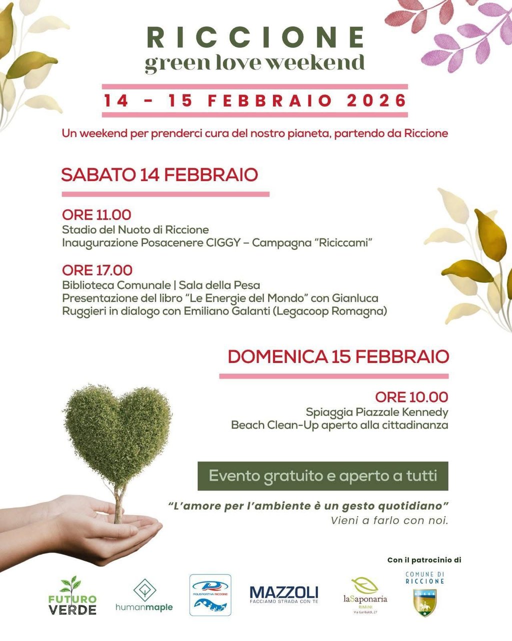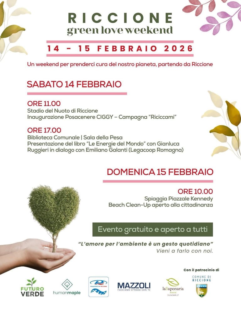 Questo San Valentino celebriamo l’amore in tutte le sue forme: non solo verso le persone, ma anche nei confronti del pianeta che ci ospita. Prosegue così il nostro Mese della Sostenibilità, con un fine settimana dedicato alla cura del territorio, alla partecipazione e alla sensibilizzazione ambientale, grazie al patrocinio del Comune di Riccione e alla collaborazione nata con Polisportiva Riccione, Human Maple e la sua campagna #Riciccami.